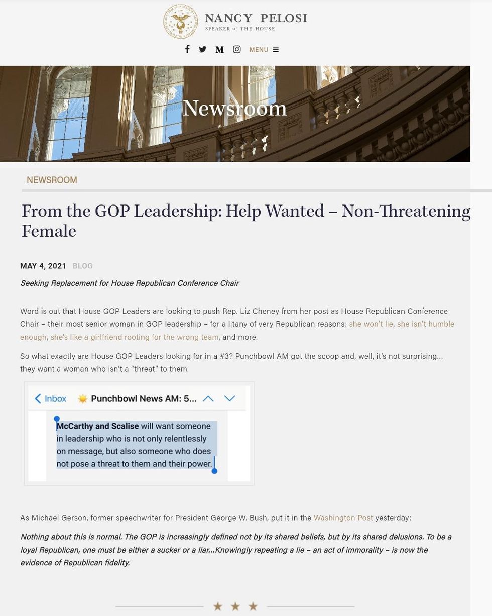 Pelosi then mused what the House GOP might be looking for in a replacement for Cheney, before answering the question with a screenshot of a report in the DC news blog Punchbowl that answers that very question.
