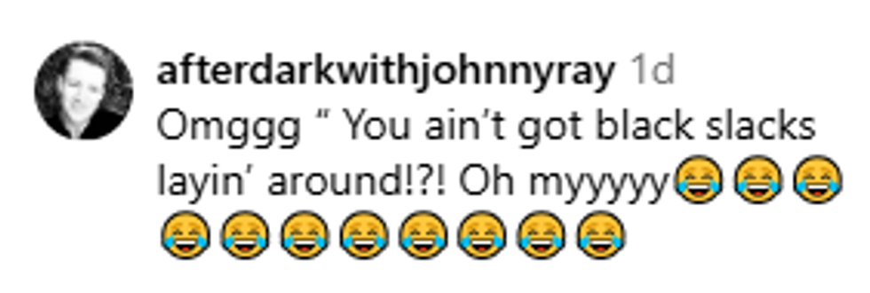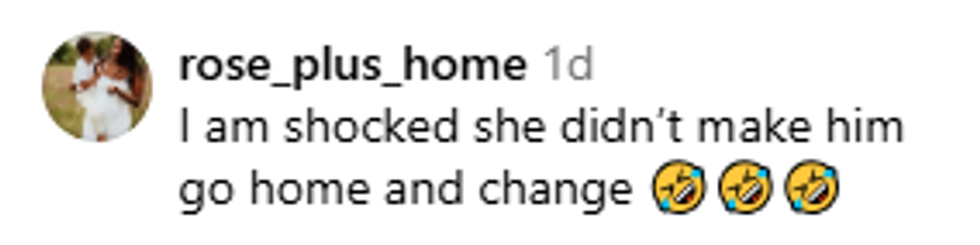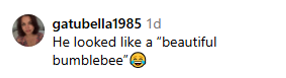 "He just looked like a beautiful bumblebee, but not for... You're my officiant! You don't got black slacks laying around?"