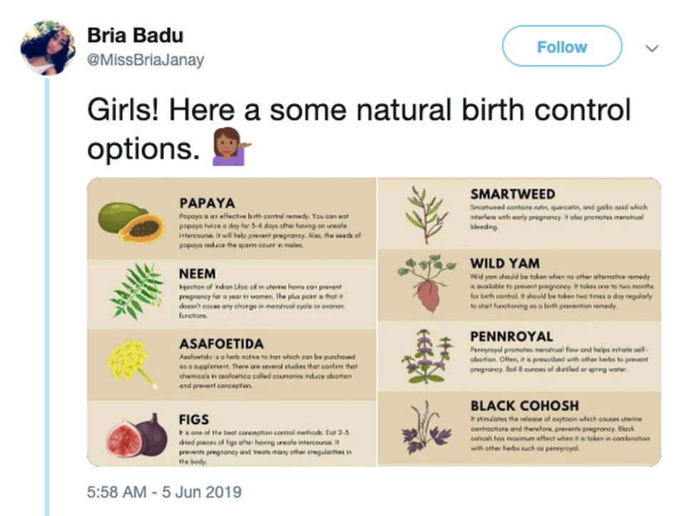 In a recent tweet which has now, thankfully, been deleted, podcast host @MissBriaJanay suggested a variety of "natural birth control options" women could use if they didn't have access to standard contraceptives.