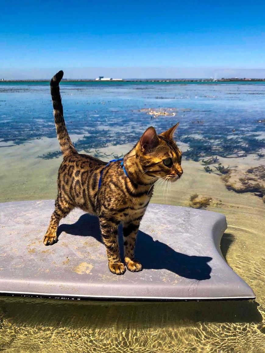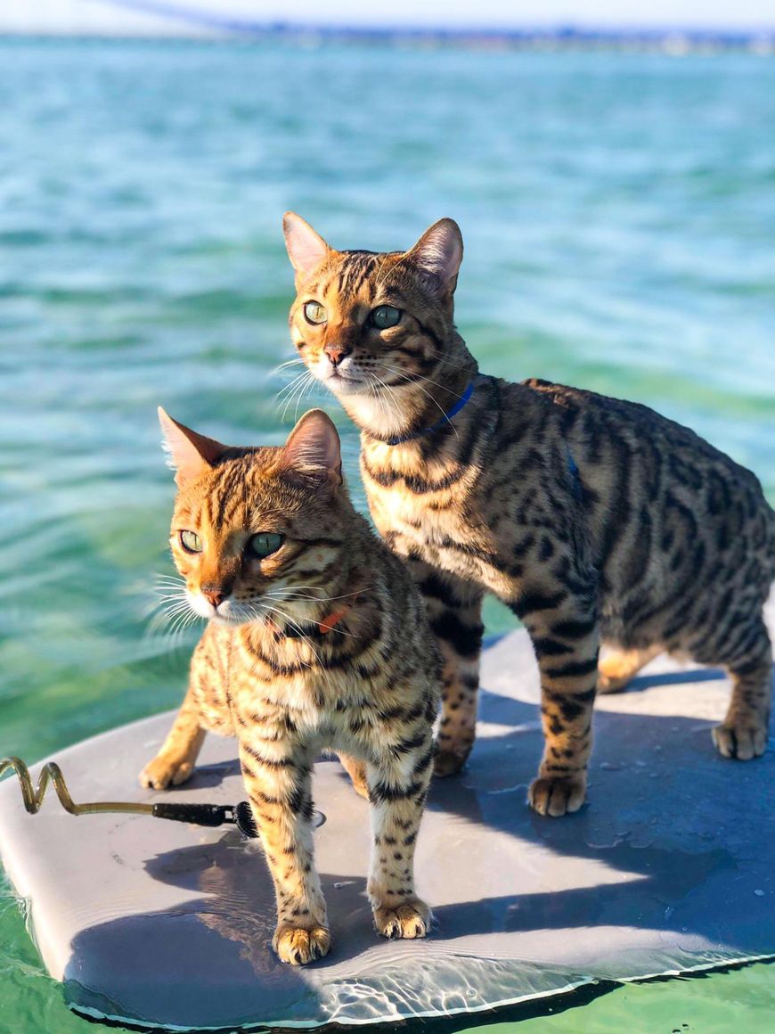 Beautiful year-old Bengal cats Maui and Star think surfing with their owner, wellbeing coach Rebecca Darracott, 42, and her scaffolder partner Rex Rimene, 36, is the purr-fect hobby for any self-respecting puss.