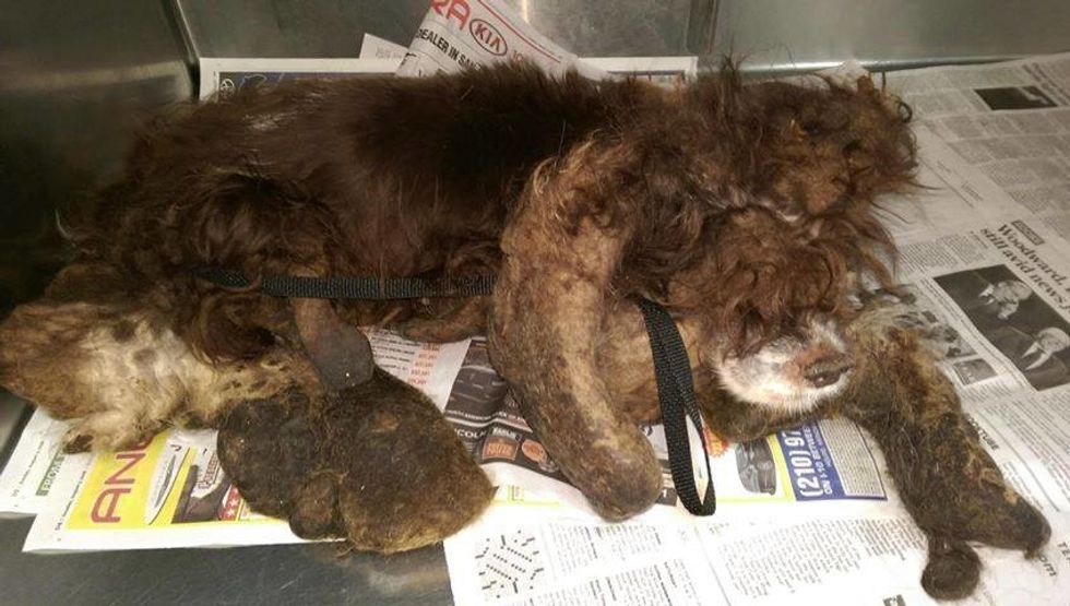 San Antonio authorities received a call about an unknown animal struggling in the road. Police officers rolled up to the scene to find a small brown mass of matted fur stumbling around. To their surprise, the mass ended up being a dog. Based on these photos from the day he was found, we can see why there may have been confusion. Hamish's fur had gotten so matted and twisted that it made his body shape almost unidentifiable.