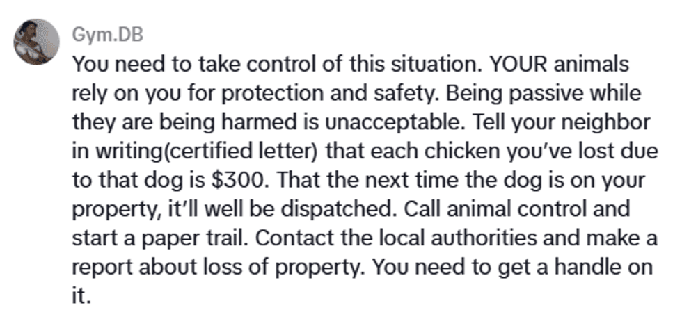Lilah noted that after the sixth attack, the neighbor remained unwilling to help, so Lilah's husband stated that he planned to shoot the dog if it came on the property again to attack the chickens.