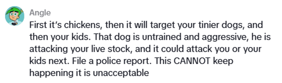 The neighbor insisted that this land belonged to the dog and that there was nothing they could do about the dog's behavior. They placed the responsibility on Lilah to close up her chickens where the dog wouldn't be able to reach them. The problem was that Lilah had an enclosed area for the chickens, a yard to free graze, as well as their front porch, and the dog welcomed itself into every space.