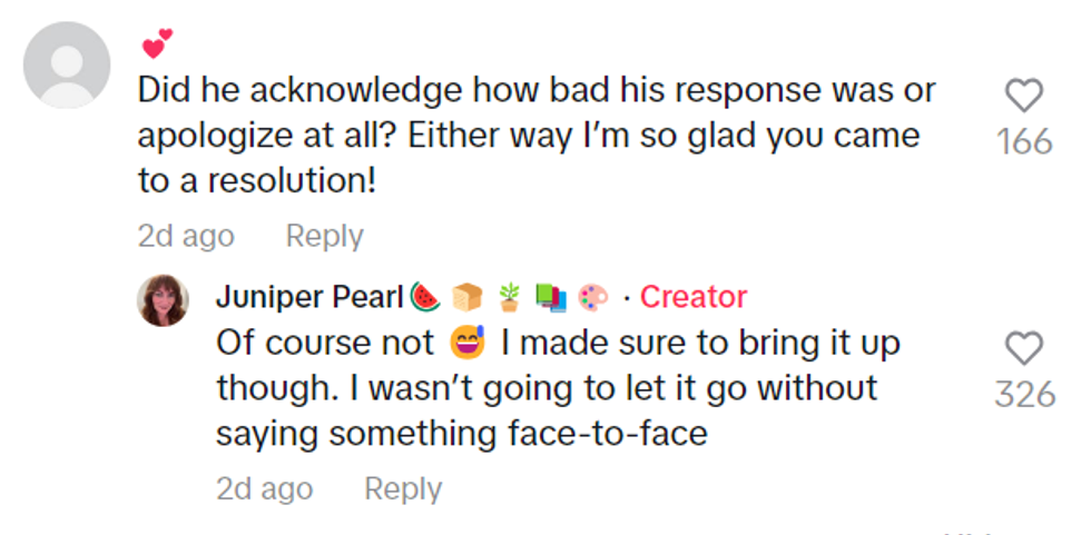It would have been nice if her neighbor had at least apologized for his earlier actions, though.