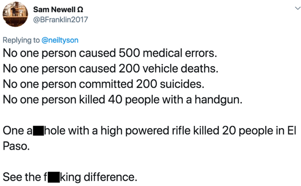 In response to the attacks, noted astrophysicist Neil deGrasse Tyson opted to point out various statistics about death tolls from other more common killers like car accidents and medical errors.