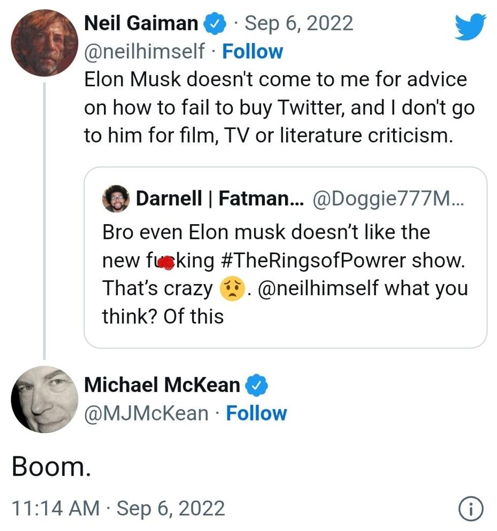 Perhaps for that reason a fan—Doggie777Moon—decided to solicit Gaiman's take on Musk's criticism. Gaiman has no direct connection to the Rings project.