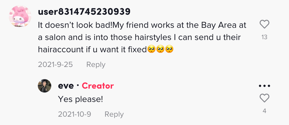 TikToker @gl0babie, known as Eve, sobbed her way through the TikTok as she tried to show everyone what haircut she was going for, versus what haircut she was given.