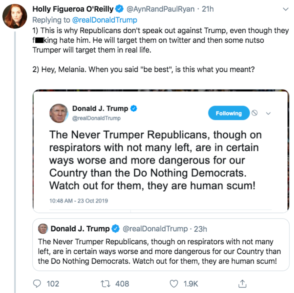 "The Never Trumper Republicans, though on respirators with not many left, are in certain ways worse and more dangerous for our Country than the Do Nothing Democrats. Watch out for them, they are human scum!"