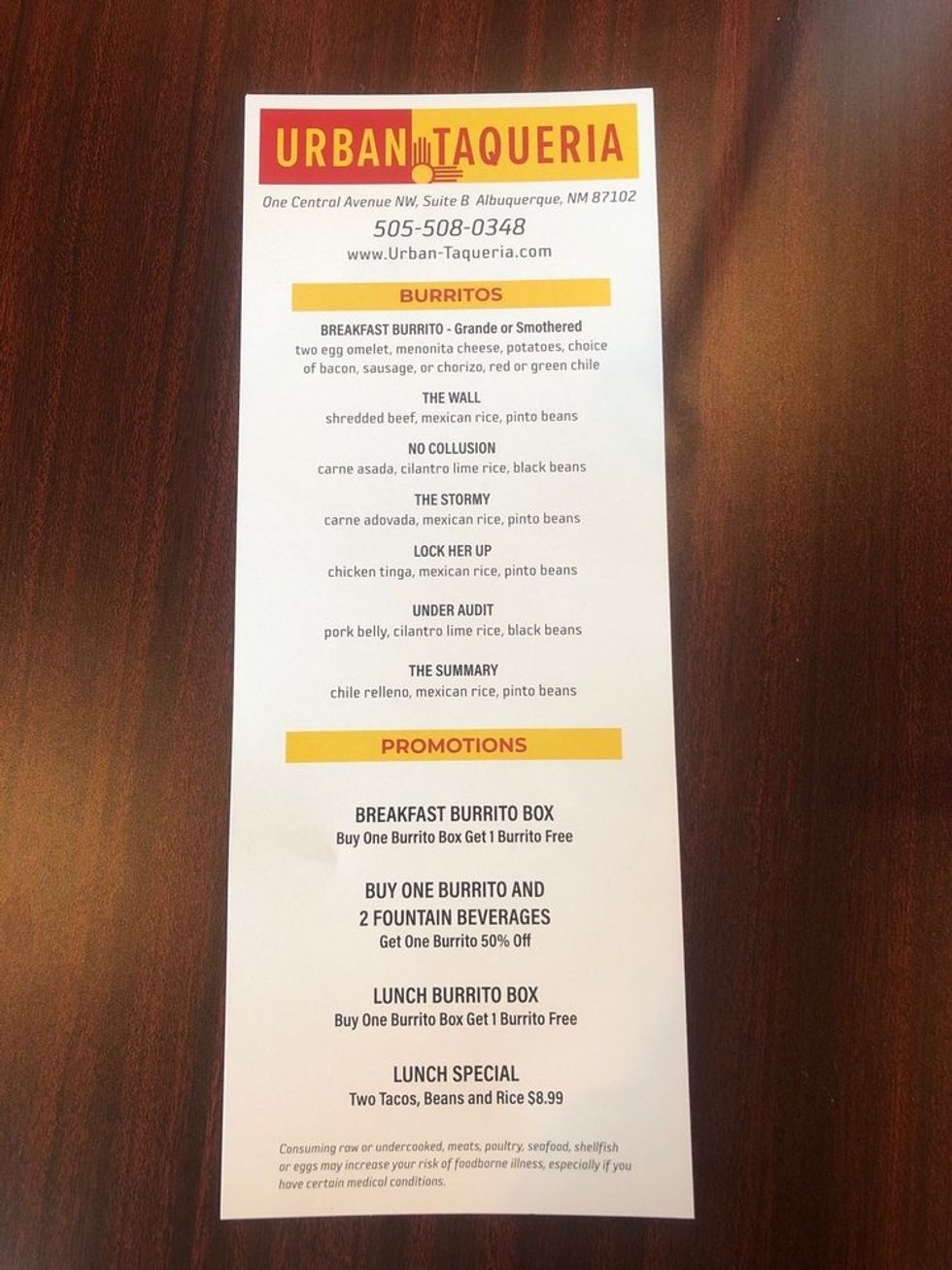 Urban Taqueria, a locally owned Albuquerque establishment, recently opened with menu items named after phrases commonly used by President Donald Trump.