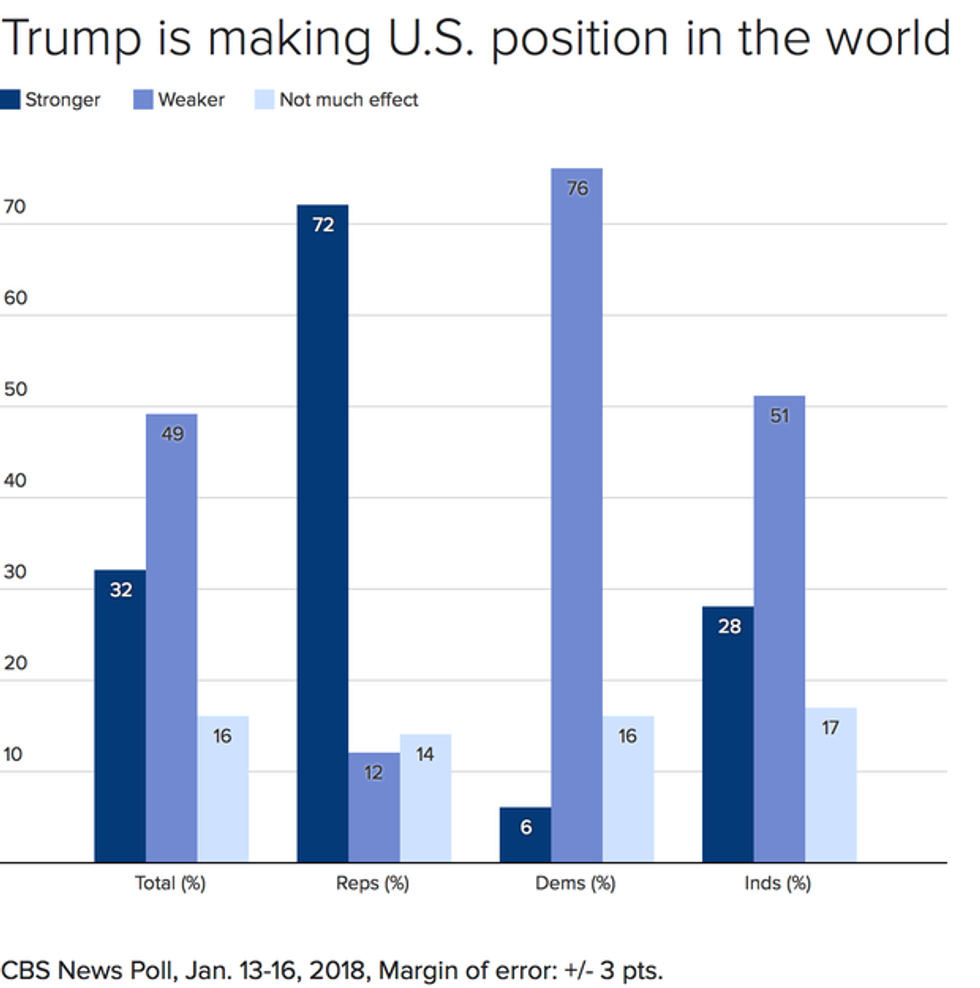 As President Donald Trump arrives in Davos, Switzerland for the World Economic Forum, a new CBS News poll reveals 49 percent of Americans believe Trump made the United States weaker on the world stage while only 32percent believe he made it stronger. 16 percent see Trump having little effect.
