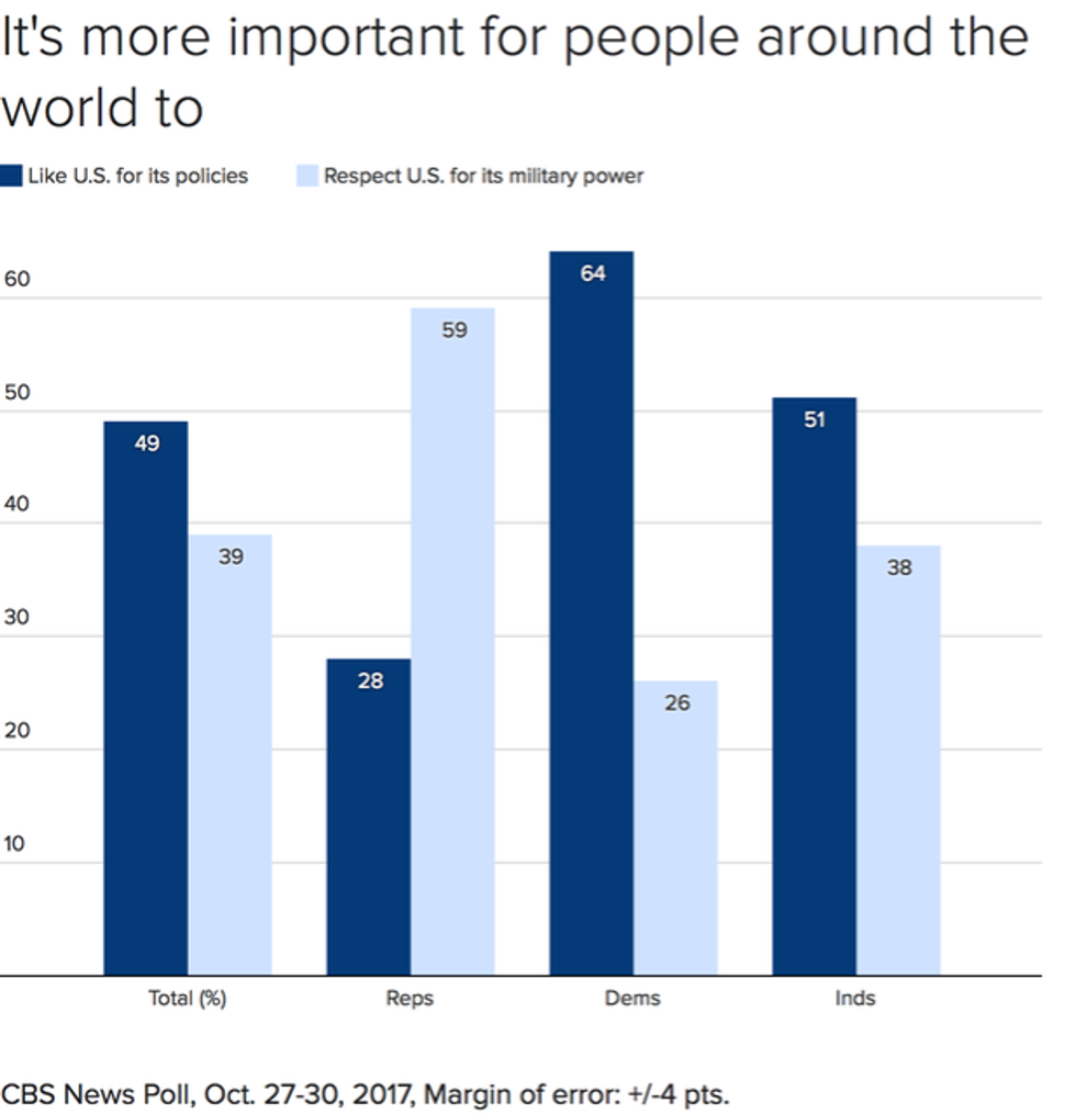 Trump pledged to make the military stronger which resonates with his own current political party. 59 percent of Republicans consider it more important for the U.S. to be respected for its military might. Most Democrats think world respect for U.S. policies takes precedence. This divide remains unchanged since May 2003, weeks into the Iraq War, when CBS last asked the question.