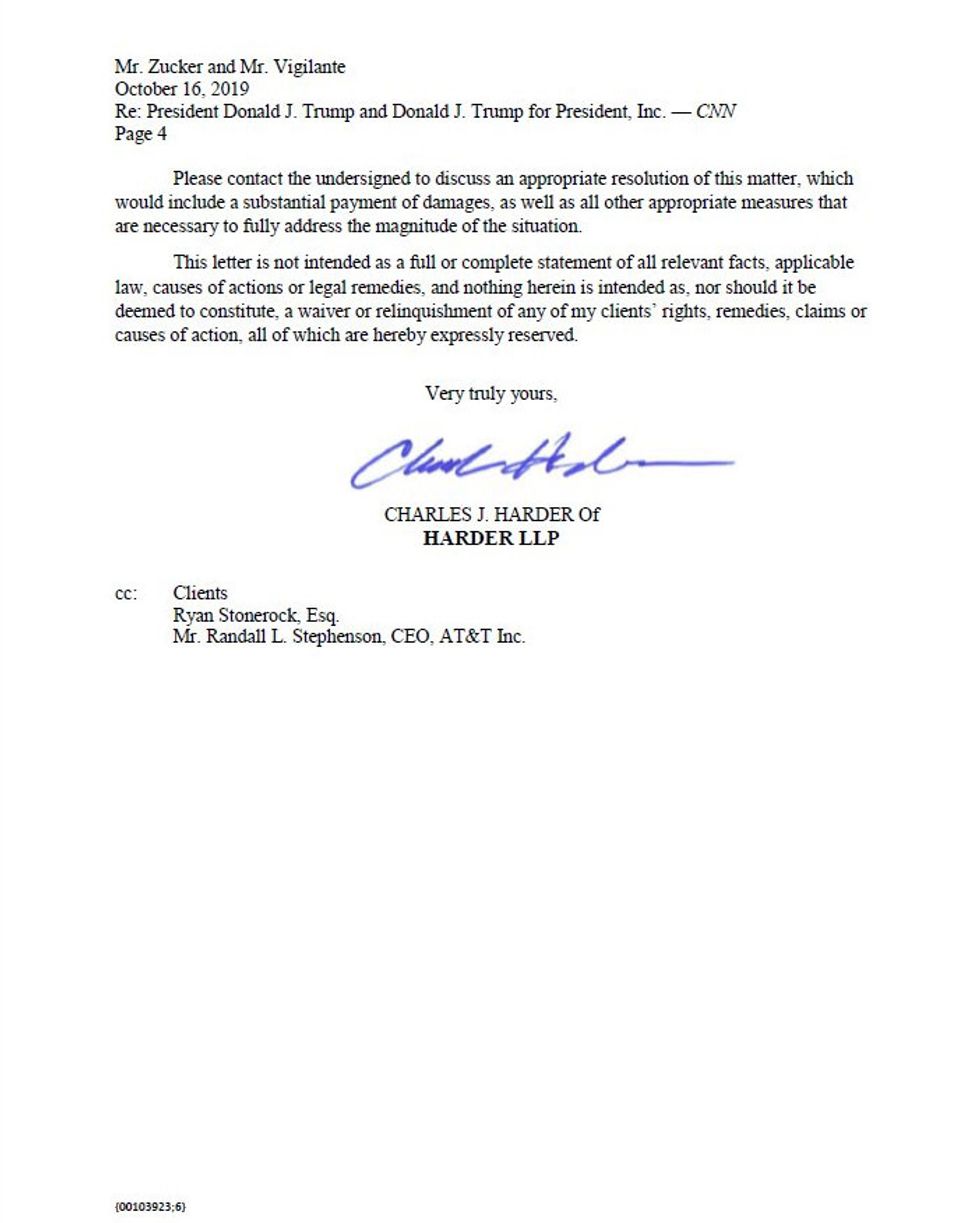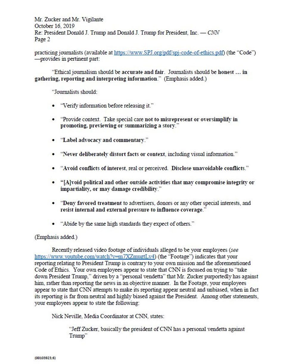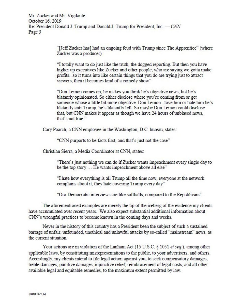 “In the Footage, your employees appear to state that CNN attempts to make its reporting appear neutral and unbiased, when in fact its reporting is far from neutral and highly biased against the President...Never in the history of this country has a President been the subject of such a sustained barrage of unfair, unfounded, unethical and unlawful attacks by so-called ‘mainstream’ news, as the current situation.”
