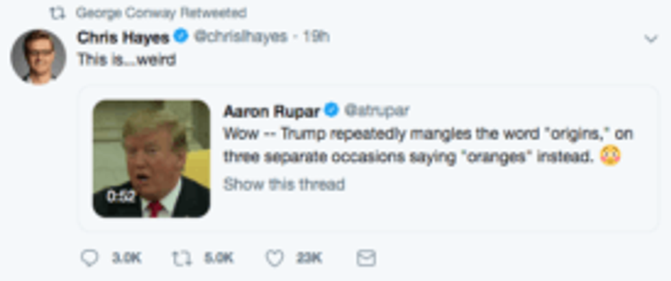 Conway retweeted a video from the meeting with Stoltenberg in which Trump repeatedly says the word "oranges" in an effort to say "origins."