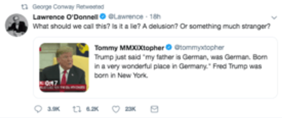Conway also retweeted a video from the same meeting in which Trump—for the third time—declares his father was born in Germany. Fred Trump was born in the Bronx.