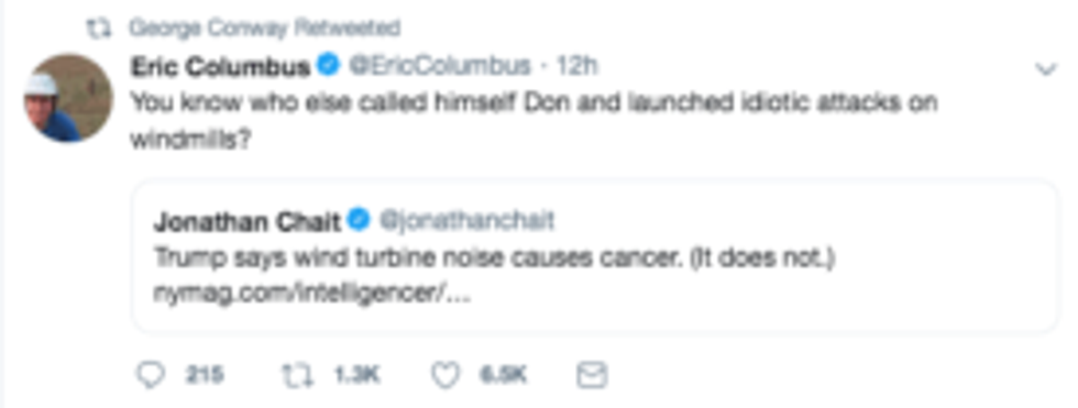 Trump's words took a turn for the worse at the NRCC dinner later that night, as Conway informed his followers, retweeting a comparison of the President to Don Quixote—the main character of a Spanish novel by Miguel de Cervantes. Quixote, who becomes mad in his immersion of chivalric literature and propaganda, confuses wind mills for giants and vows to slay them.
