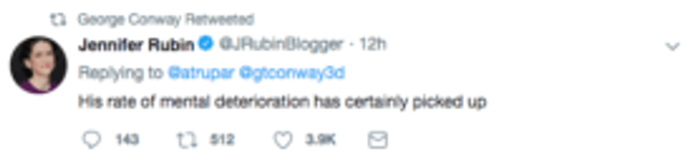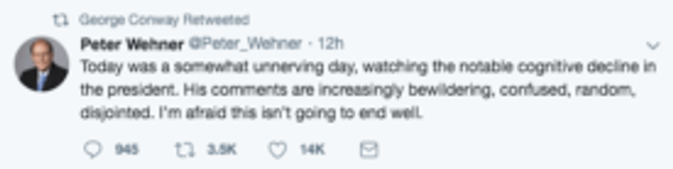 Longtime Trump critic and husband to Trump advisor Kellyanne Conway, attorney George Conway made sure to let the public know about each one. Conway has speculated on Trump's mental fitness before and revived those speculations again, retweeting news of the President's latest remarks as evidence.