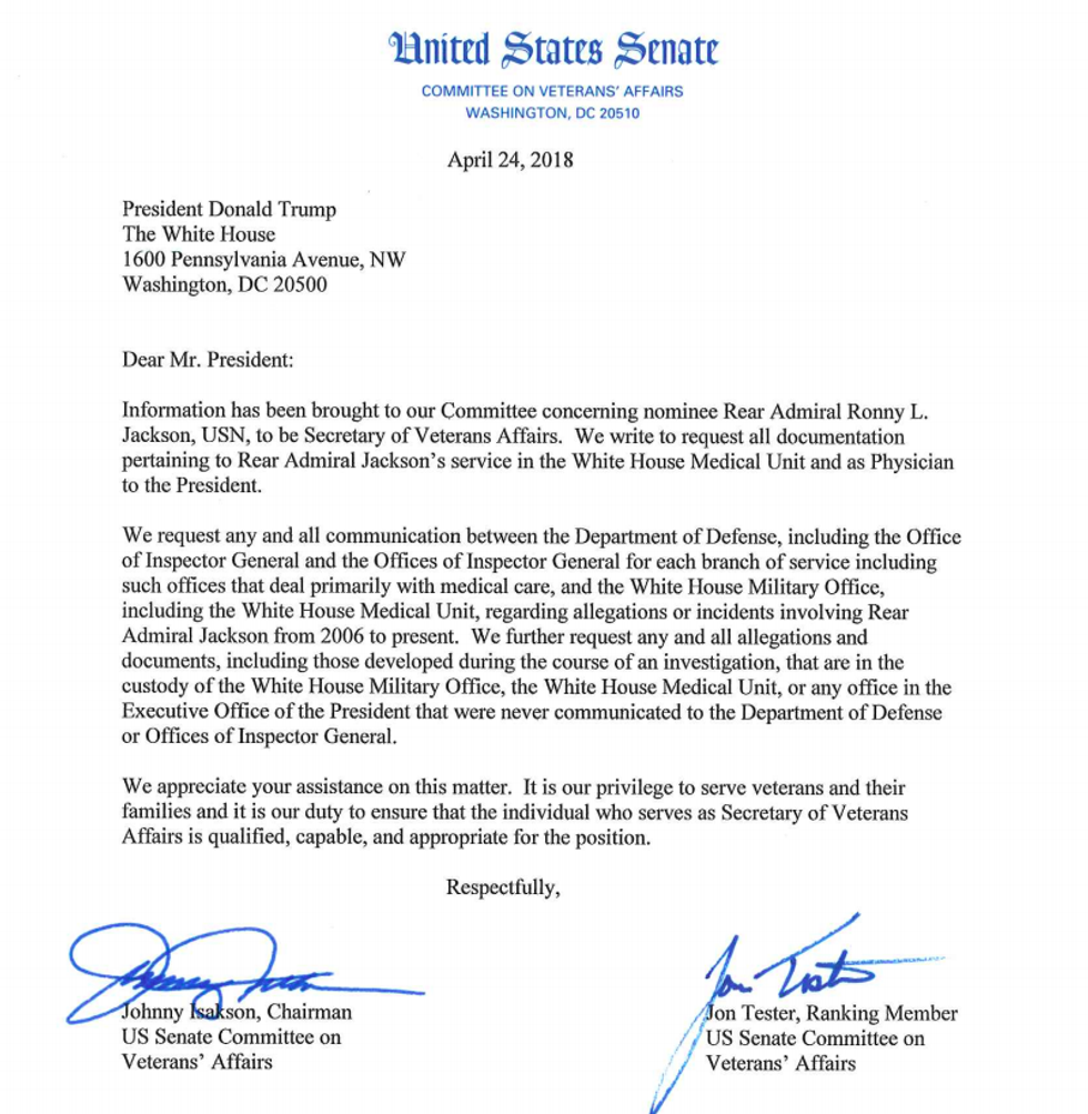 In a letter to the president, Senators Isakson and Tester requested "all documentation pertaining to Rear Admiral Jackson's service in the White House Medical Unit and as Physician to the President."