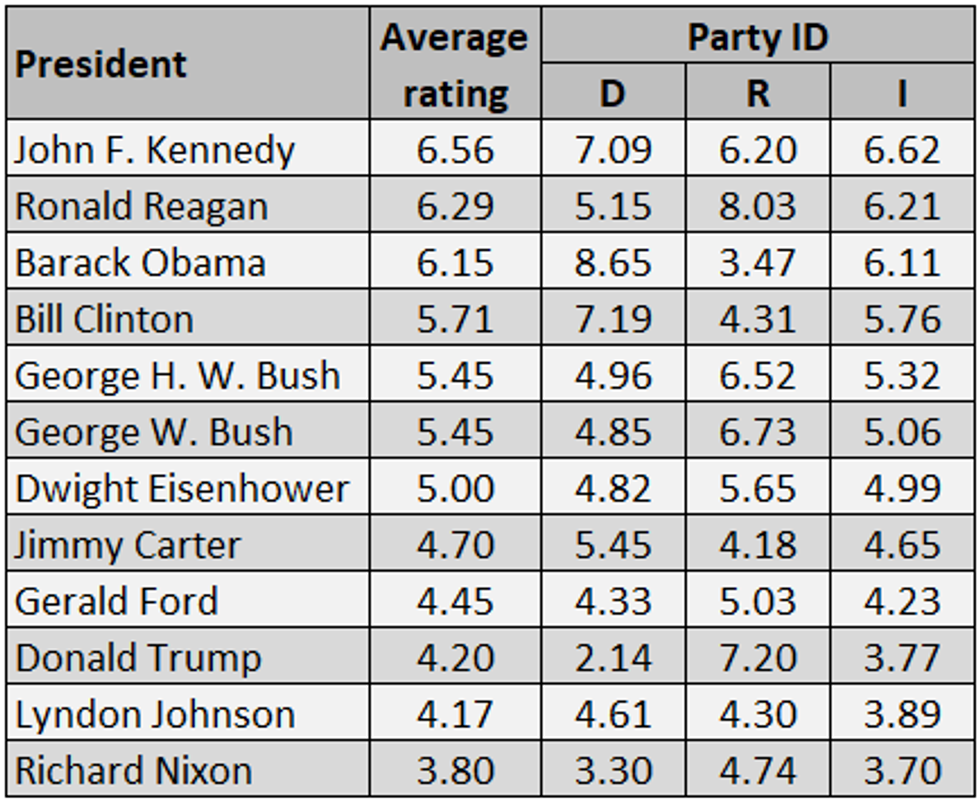 Table 1: Average overall rating for each modern president and by respondent’s party ID