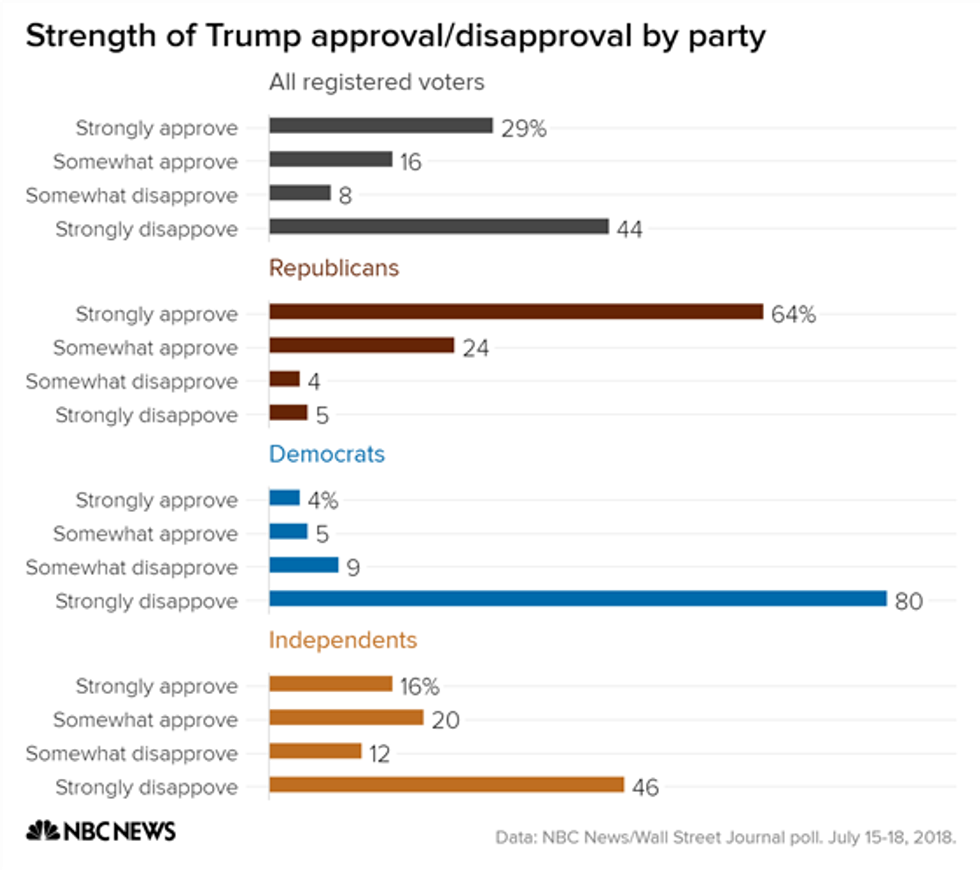 Among Democrats, Trump's approval sits at an abysmal nine percent. The president's numbers among independents are also circling the drain, with just 36 percent saying they approve of his performance. Independent voters are essential for victory in November's midterm elections.