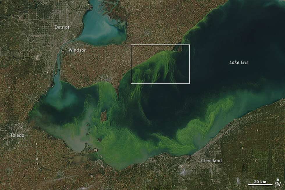 Satellite imagery taken Sept. 26 of the fourth-largest of the Great Lakes shows 700 square miles of water fluorescing with swirls and clouds of bright green, almost as if someone had emptied a giant glow stick in preparation for Halloween.