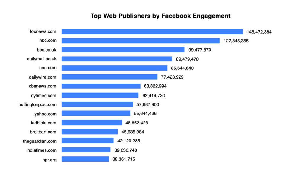 NewsWhip published the results of a study of Facebook news feed content and Fox News posts got the most shares, comments, and reactions - almost 20,000,000 more than the closest competitor, NBC news.