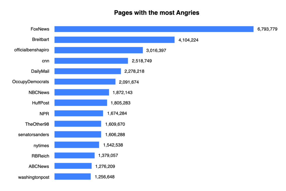That gap is even more pronounced when they looked at angry reactions alone: Fox News posts got 6,793,779 angry reactions. Breitbart came in second, lagging behind with 4,104,224 angry reactions.