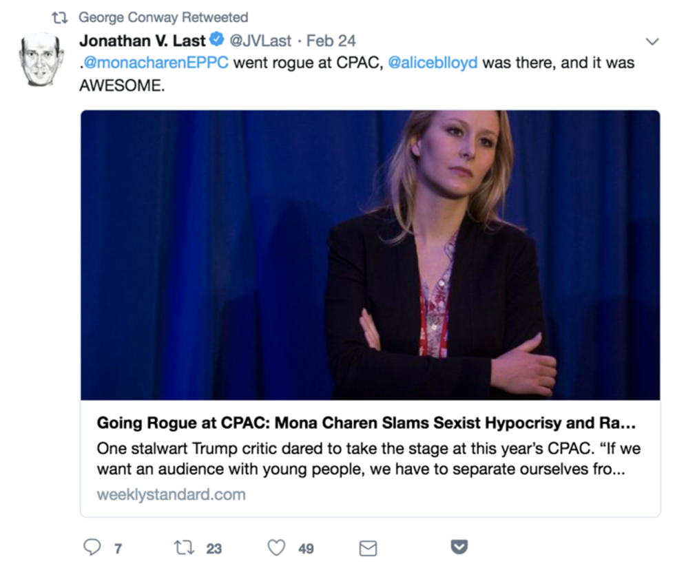 In February, Conway made headlines after he retweeted an article which praised conservative columnist Mona Charen, who’d rebuked Trump after his incendiary statements at the Conservative Political Action Conference.