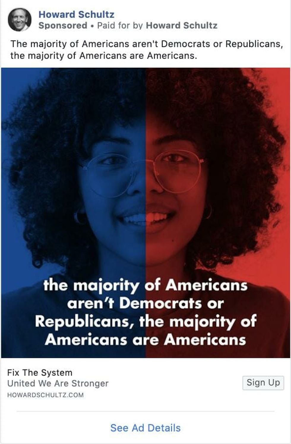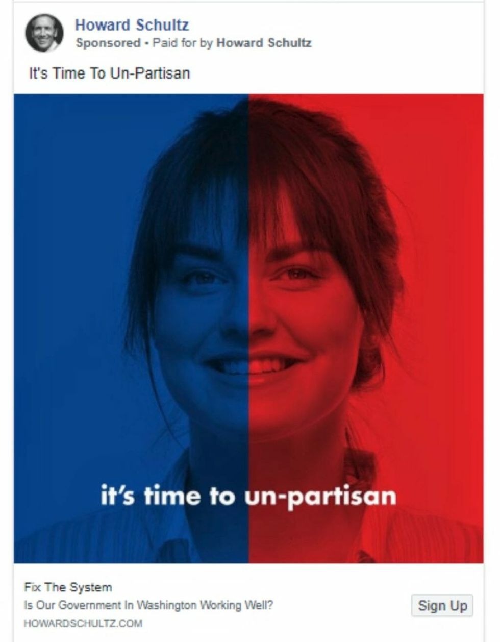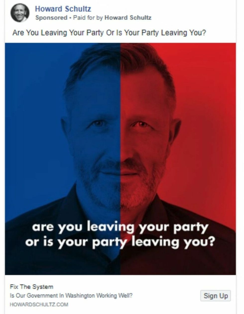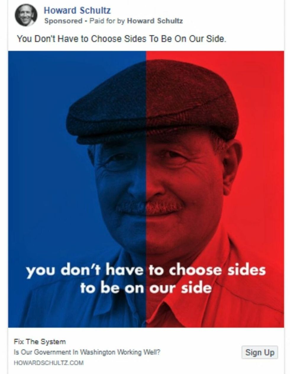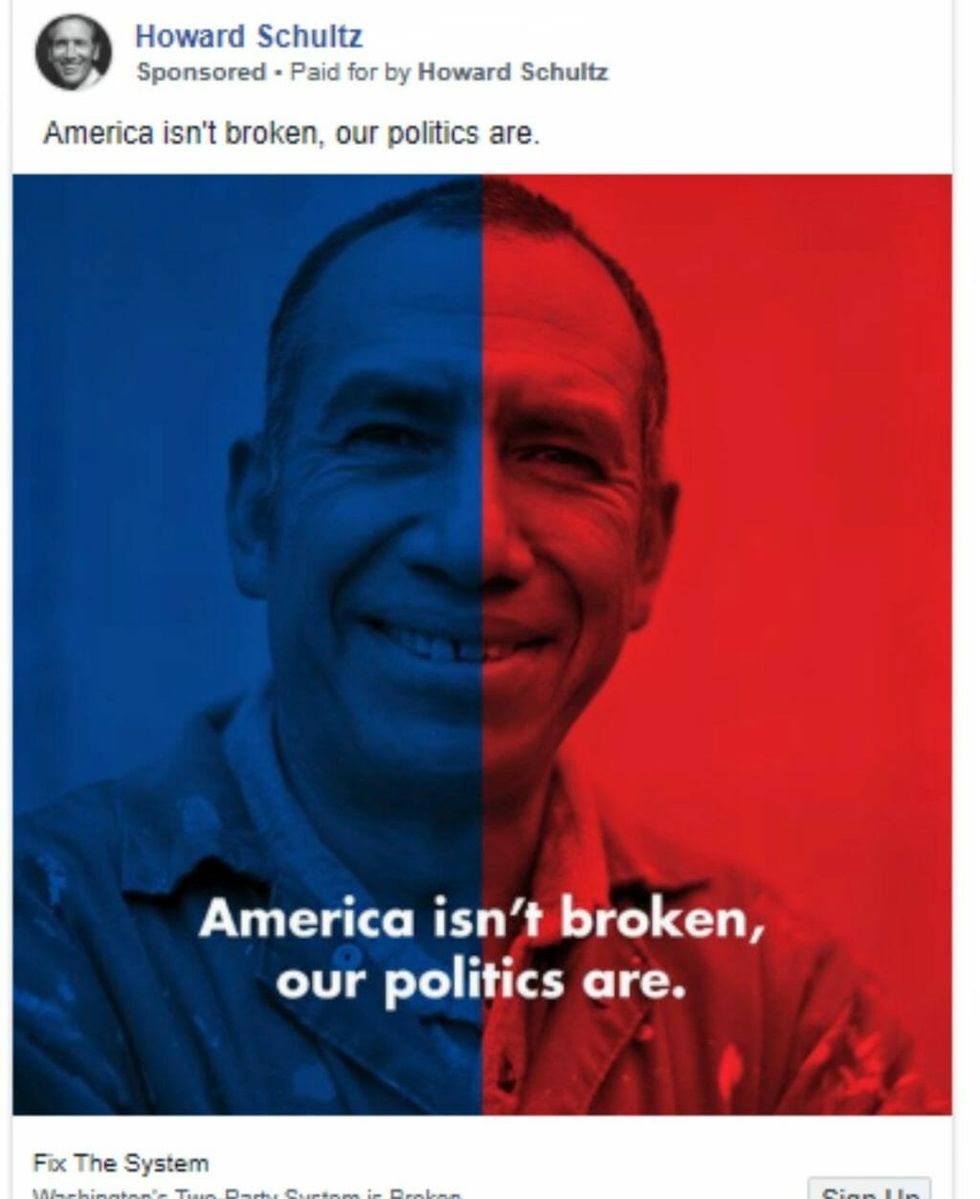 His latest ad was a sponsored post on Facebook by Schultz. The caption read: