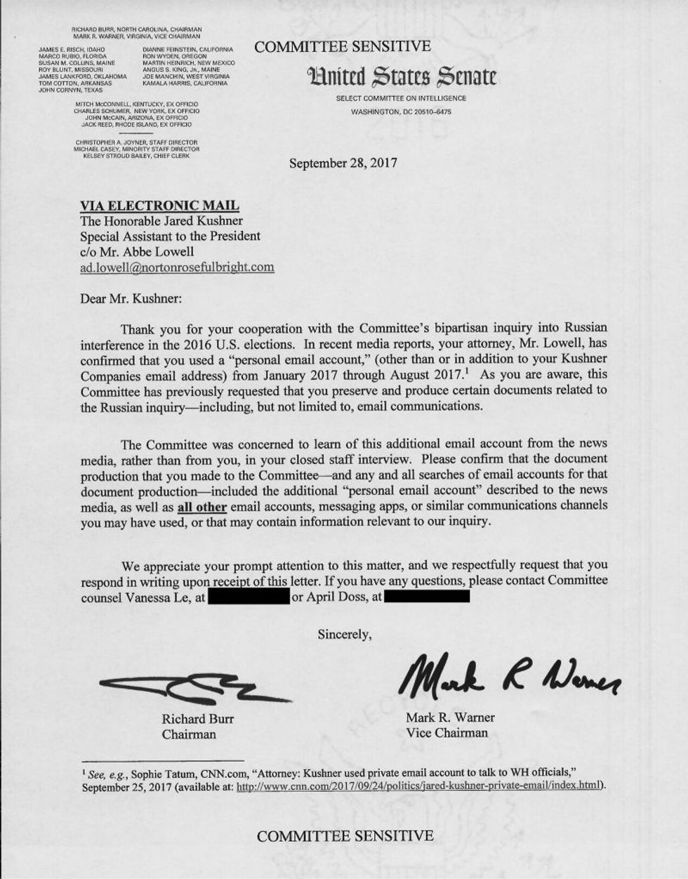 The chairman of the committee, Senator Richard Burr (R-N.C.), and the vice chair, Senator Mark Warner (D-VA), only learned of the personal email account, which Kushner used from January through August of this year, via news reports. The two men were reportedly so upset that they wrote Kushner a letter via his attorney Thursday instructing him to double-check he has turned over every pertinent document for the committee's investigation.