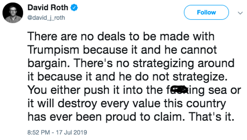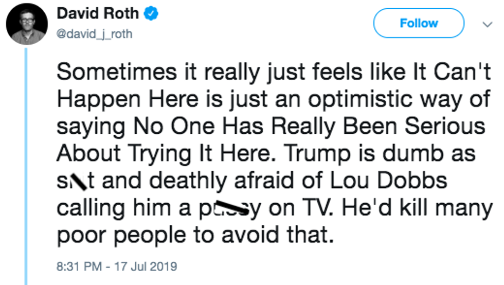 Writer David Roth noted the fascism is a byproduct of Trump's influencers, not a grand design by the man himself.