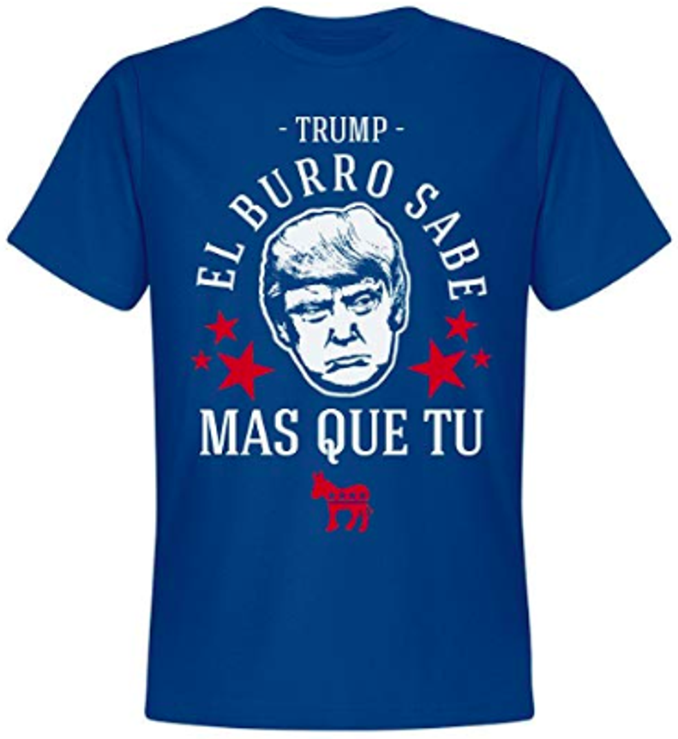 Want to make a statement? This shirt with "Trump, el burro sabe mas que tu" is available here.