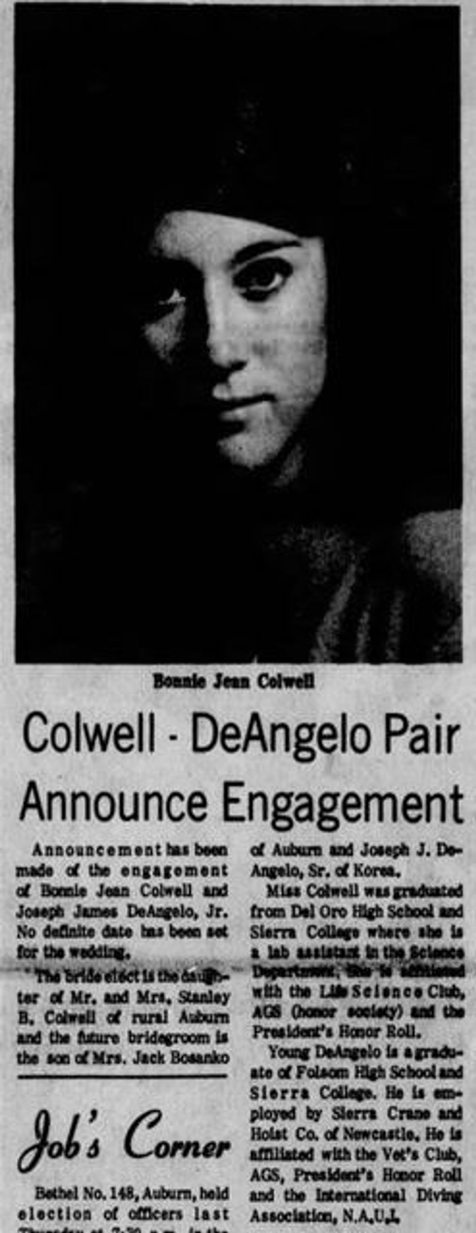 A newspaper clipping posted to Reddit reveals that Colwell was the daughter of Mr. and Mrs. Stanely B. Colwell of Auburn. Bonnie Jean Colwell graduated from Del Oro High School. She studied at Sierra College, where she worked in the Science Department as a lab assistant. During her time at Sierra, she was on the President's Honor roll.