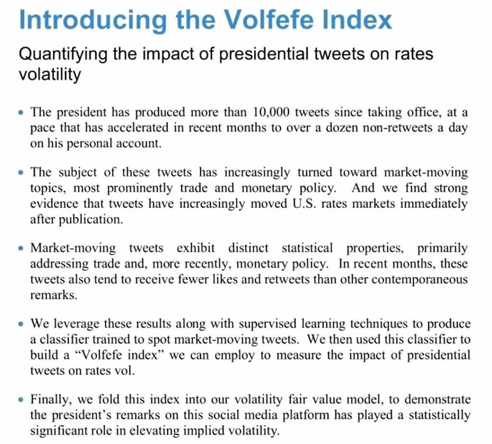 JP Morgan Chase—which uses the JP Morgan brand for their investment banking, asset management, private banking, private wealth management and treasury services divisions—announced the new Volfefe Index with a detailed explanation for its necessity.