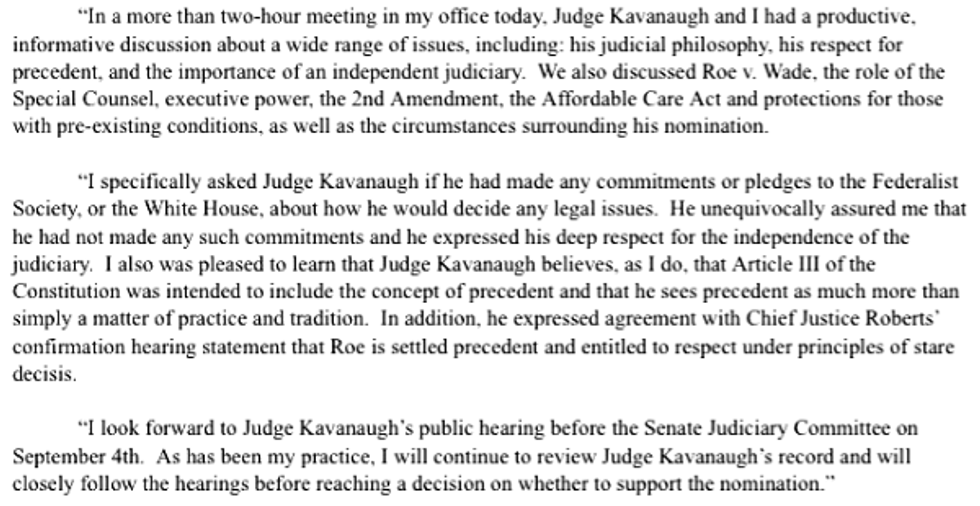 As a staunch pro-choice advocate, any wavering in Kavanaugh's commitment to settled law would change Collin's stance on Trump's nominee.