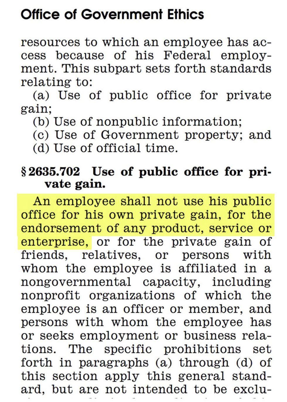 “Conway’s encouragement to buy Ivanka’s stuff would seem to be a clear violation of rules prohibiting misuse of public office for anyone’s private gain," said Don W. Fox, former general counsel and former acting director of OGE. “This is jaw-dropping to me. This rule has been promulgated by the federal Office of Government Ethics as part of the Standards of Conduct for all executive branch employees and it applies to all members of the armed forces as well.”