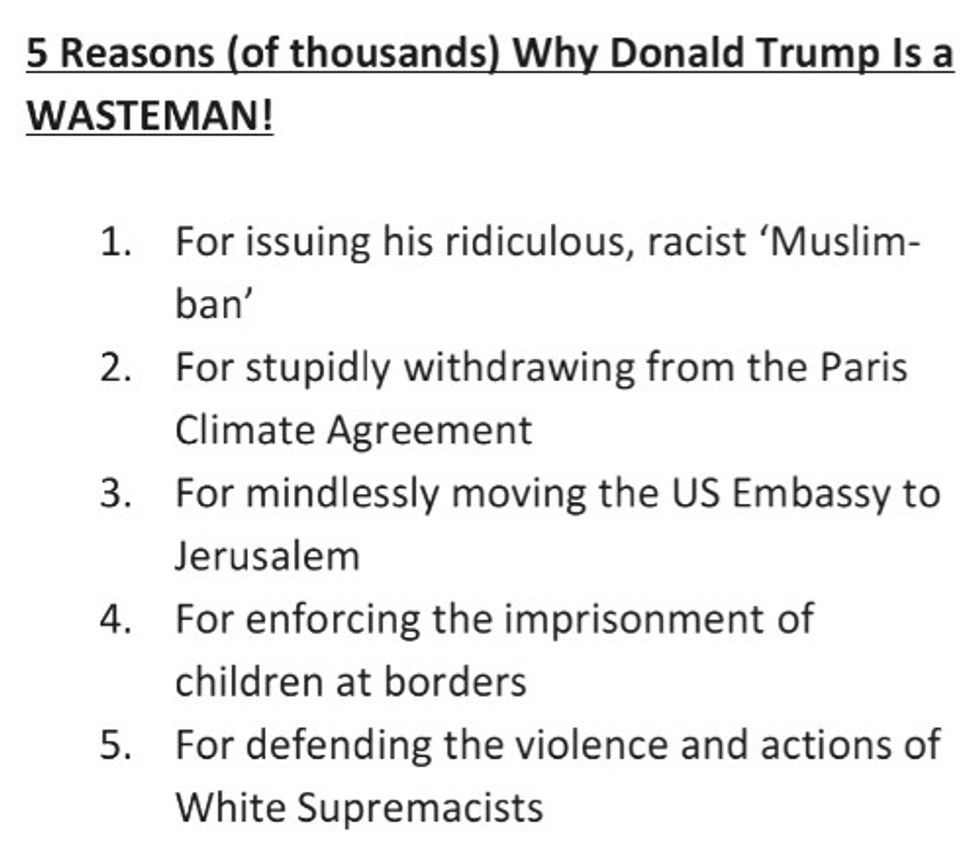 In addition to his tweet of declaration, the Lord Mayor added two lists to his post. The first covered "5 Reasons (of thousands) Why Donald Trump Is a WASTEMAN!". It includes Trump's Muslim ban, Paris Climate Accord withdrawal, moving the U.S. embassy to Jerusalem, family separations by DHS and ICE and his reactions to activities by known White supremacist groups.
