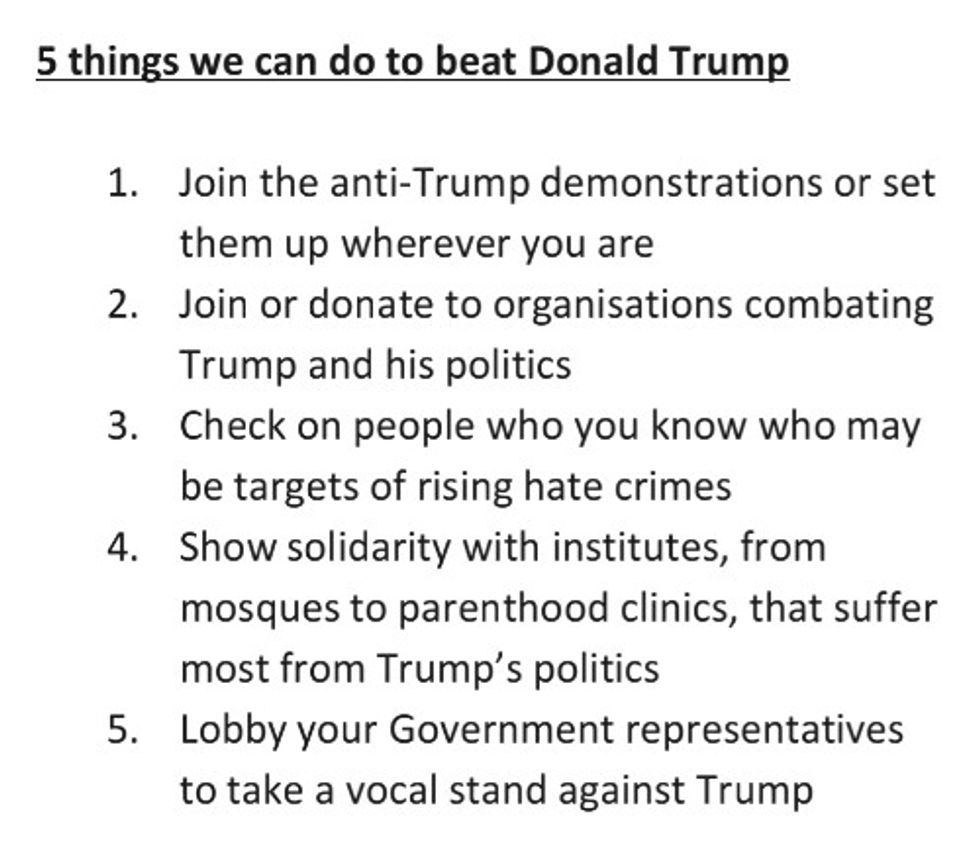 The second lists "5 things we can do to beat Donald Trump." The list includes demonstrating, working with organizations opposing Trump's policies, looking out for the targets of Trump's rally rhetoric, showing solidarity with organizations targeted like Planned Parenthood and contacting elected officials.