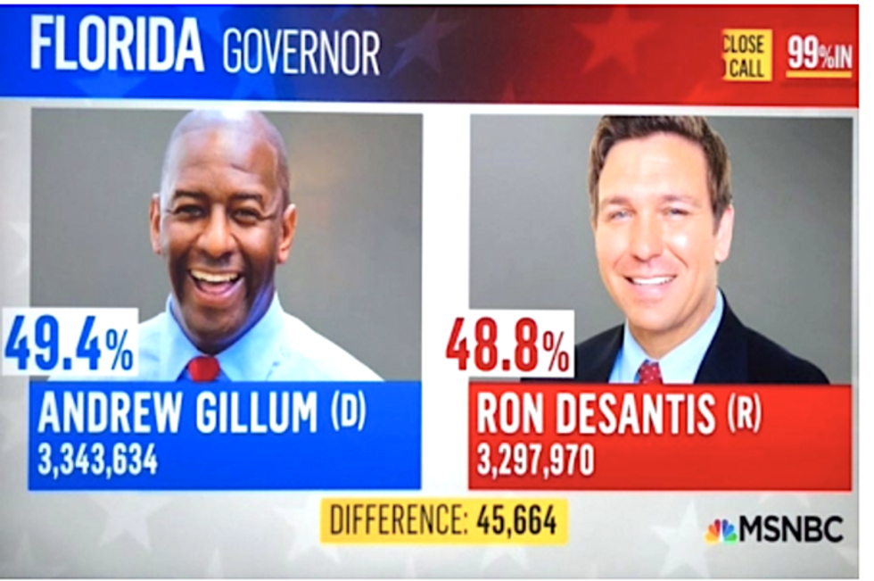 During All In with Chris Hayes, the network showed the results of the contest between Tallahassee Mayor Andrew Gillum (D) and former Congressman Ron DeSantis (R) ahead of Tuesday's election.