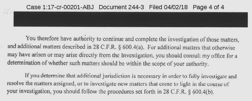 In response, Mueller released a memo from Deputy Attorney General Rod Rosenstein outlining the scope and specific allegations against individuals to be investigated. The heavily redacted memo, to remove any portions relating to individuals other than Manafort, proves Mueller had authority to investigate Manafort.