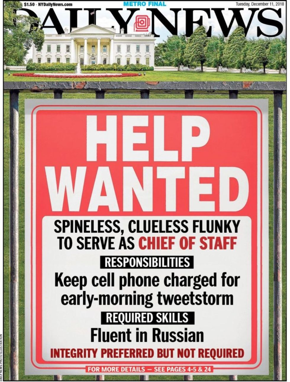 "HELP WANTED: SPINELESS, CLUELESS FLUNKY TO SERVE AS CHIEF OF STAFF RESPONSIBILITIES: Keep cell phone charged for early-morning tweetstormREQUIRED SKILLS: Fluent in Russian