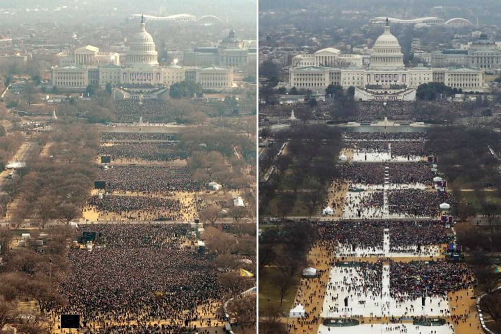 Trump, often through embattled White House Press Secretary Sean Spicer, has quibbled over the size of the crowd that attended his inauguration ever since the National Park Service retweeted a post comparing the crowd size at Trump's inauguration to the larger crowd at former President Barack Obama's 2009 inauguration. Two aerial photographs of the National Mall (seen below) reveal large patches of empty space during Trump's swearing-in, spaces the crowds filled at Obama's ceremony. Photographers captured the respective ceremonies around the same time of day, Trump's at 11:04 AM and Obama's at 11:30 AM.