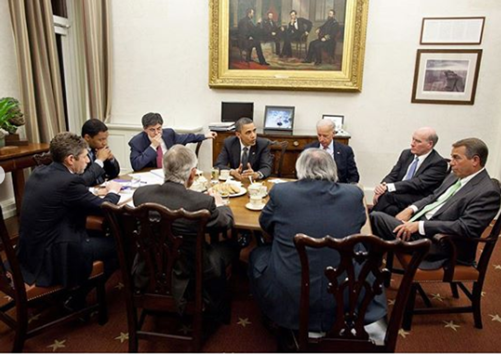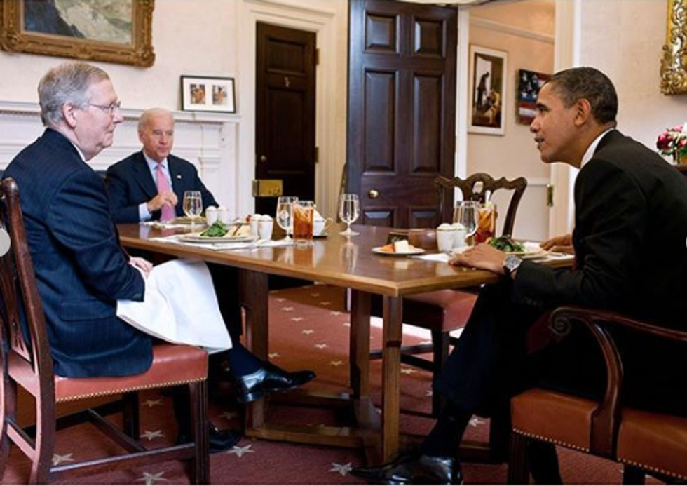 Instead, the pictures show Obama hosting guests - including former Vice President Joe Biden, then-House Minority Leader Nancy Pelosi (D-CA), Senate Majority Leader Mitch McConnell (R-KY), and other lawmakers - for lunch.