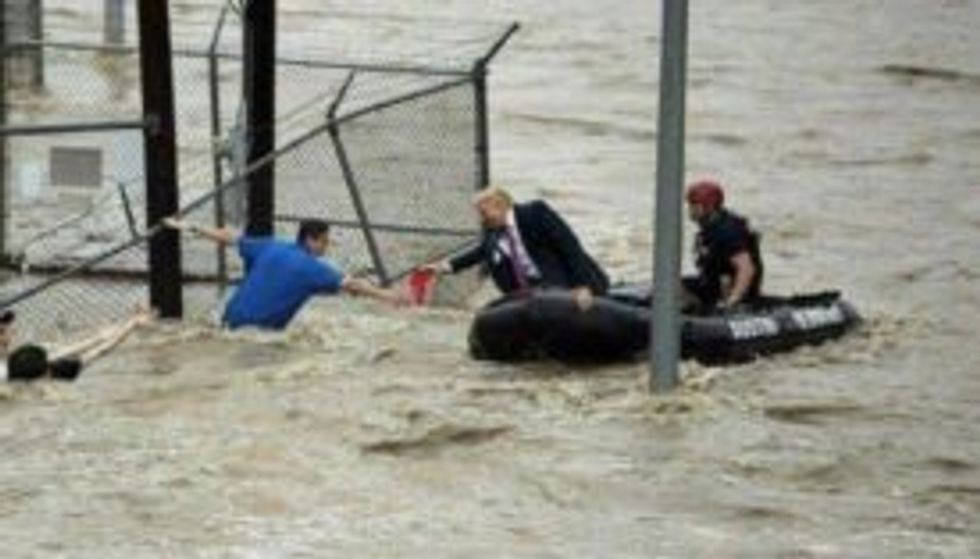 But people questioned if anyone shared it thinking the President actually participated in rescues—in a suit no less—or if it was shared as a joke. After all, it appears Trump is using a red MAGA hat as a lifeline for the man he's about to "rescue."