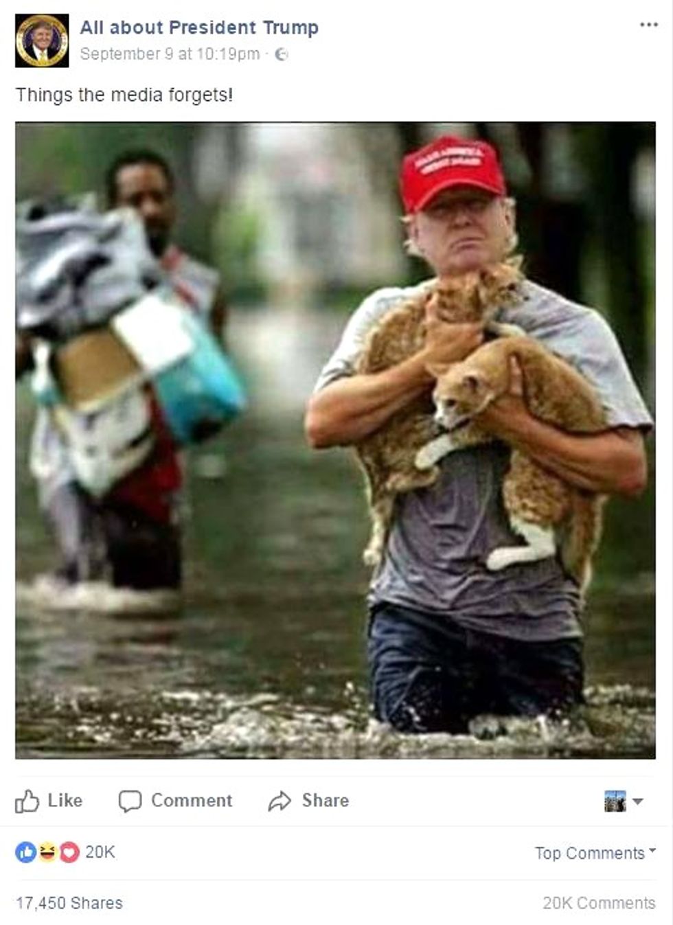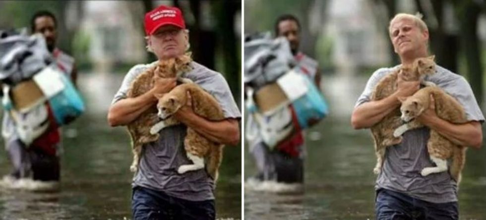 A few similar photos made the rounds after Hurricanes Harvey and Irma. The most popular was one depicting Trump in almost waist high water rescuing cats while wearing a MAGA hat.