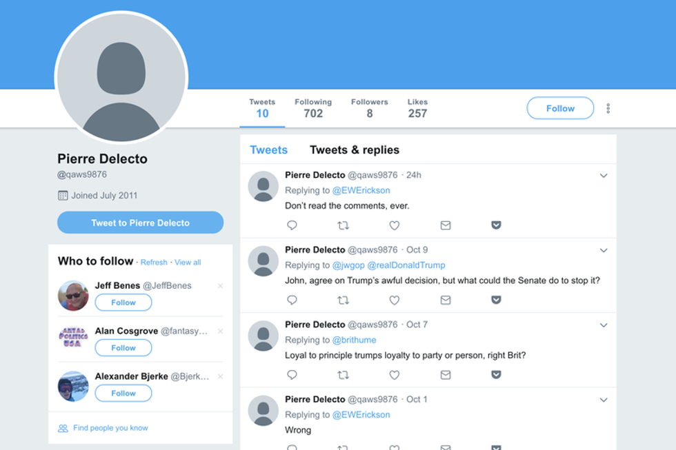 While the lurker account didn't have many surprising tweets, the name "Pierre Delecto" stood out to many.