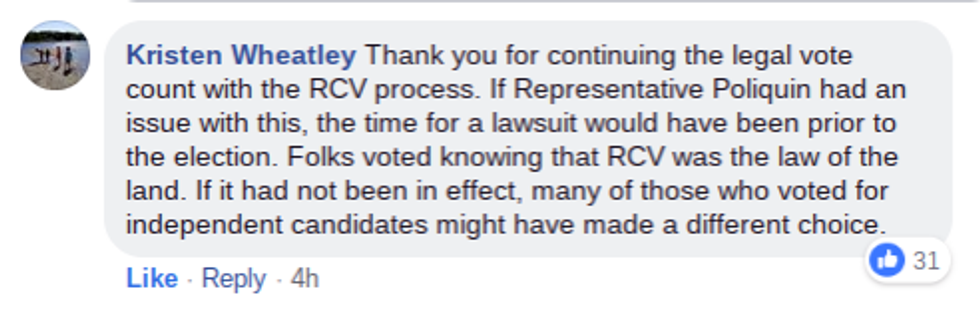 Reaction to the Secretary of State's announcement criticized the Maine GOP member Poliquin's choice to try to block ranked choice voting only after it appeared he may not win in the final tally.