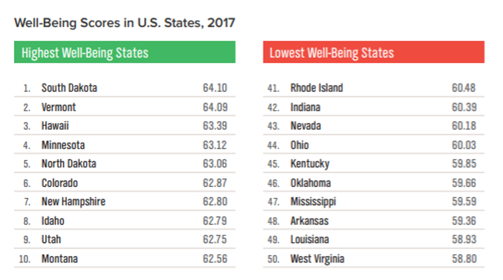 The bottom six spots were taken by states considered part of the American south: Kentucky, Oklahoma, Mississippi, Arkansas, Louisiana, and West Virginia. All 6 of the lowest scoring states voted for Trump in 2016. West Virginia ranked 50th in well-being for the 9th year in a row.