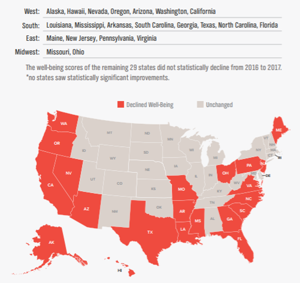 Overall, Americans' well-being dropped from 62.1 in 2016 to 61.5 in 2017, the largest single year drop since the survey was created in 2008. A record number of states, 21, showed a drop in well-being. The previous record was a 15 state drop in 2009 at the beginning of the recession.