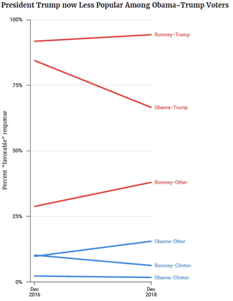 "While a majority of Obama-Trump voters still have a favorable opinion of the president, no other voting group has shifted away from the president more in the last two years."