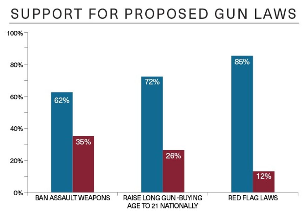 While the majority of support for gun control lies behind background checks or limiting access to guns for those with histories of certain crimes, violence or certain mental illnesses—the so-called red flag laws—support for banning assault weapons trended upward since February as well.